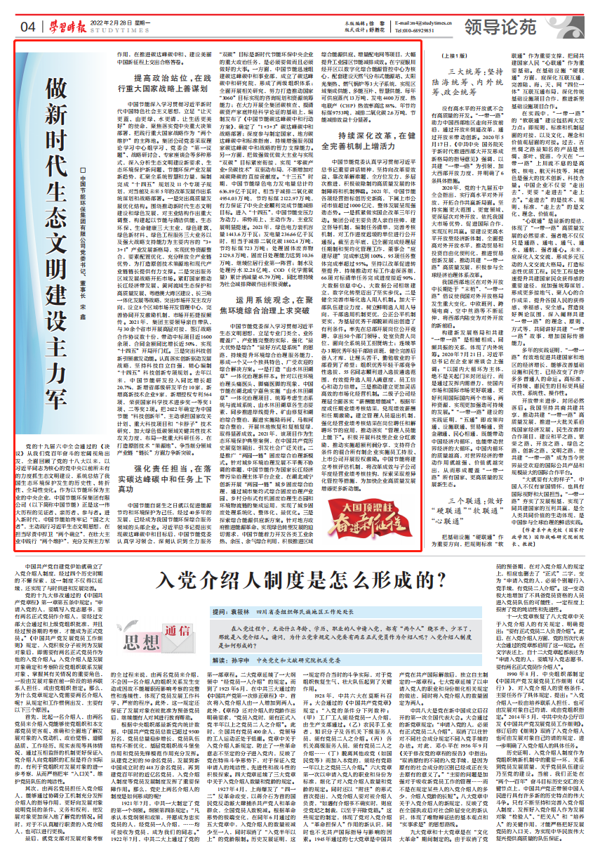 2月28日,《學(xué)習時(shí)報》刊發(fā)了集團公司黨委書(shū)記、董事長(cháng)宋鑫署名文章《做新時(shí)代生態(tài)文明建設主力軍》。文章系統闡釋了黨的十八大以來(lái),中國節能踐行重大國家戰略、落實(shí)碳達峰碳中和任務(wù)、聚焦環(huán)境綜合治理、持續深化改革等方面的戰略規劃和具體實(shí)踐。宋鑫表示,進(jìn)入新時(shí)代,中國節能始終牢記“國之大者”,主動(dòng)踐行習近平生態(tài)文明思想,在擔當盡責中捍衛“兩個(gè)確立”,在壯大主業(yè)中踐行“兩個(gè)維護”,未來(lái),將進(jìn)一步發(fā)揮主力軍作用,在推進(jìn)碳達峰碳中和、建設美麗中國新征程上交出合格答卷。